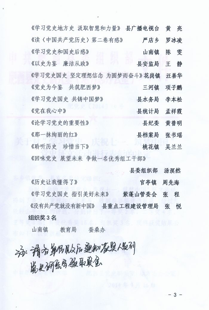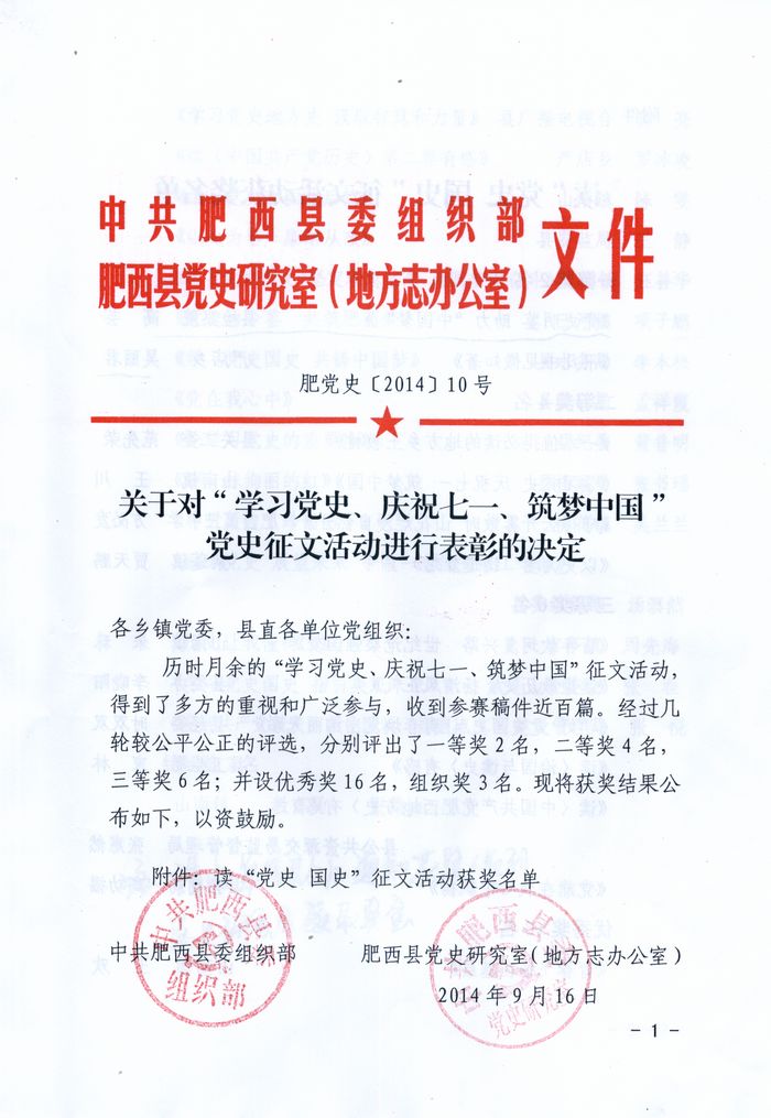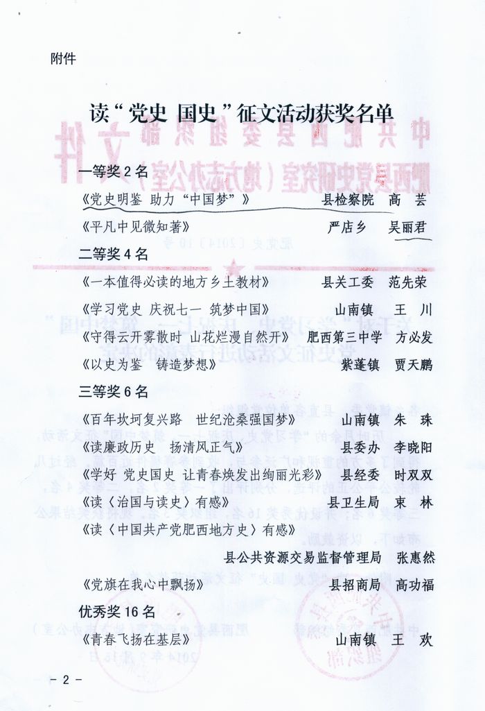 日前,由县委组织部和县党史研究室共同举办的县读“党史国史”征文活动比赛揭晓,我院法研室高芸撰写的征文《党史明鉴助力中国梦》获比赛一等奖,也是县政法机关唯一获奖人员。